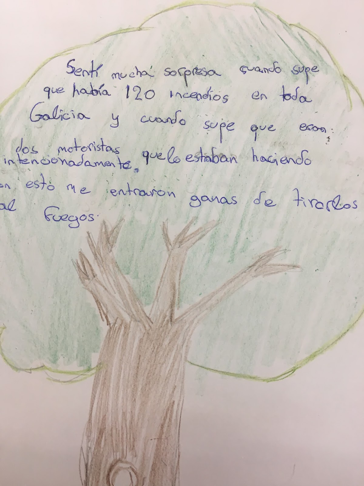 Estes son os debuxos das árbores que non verán medrar porque se perderon para sempre no lume. Dentro de esas árbores están os sentimentos dos nosos nenos e nenas nestes días de loito no que arde a nosa terra, #ardeGalicia.